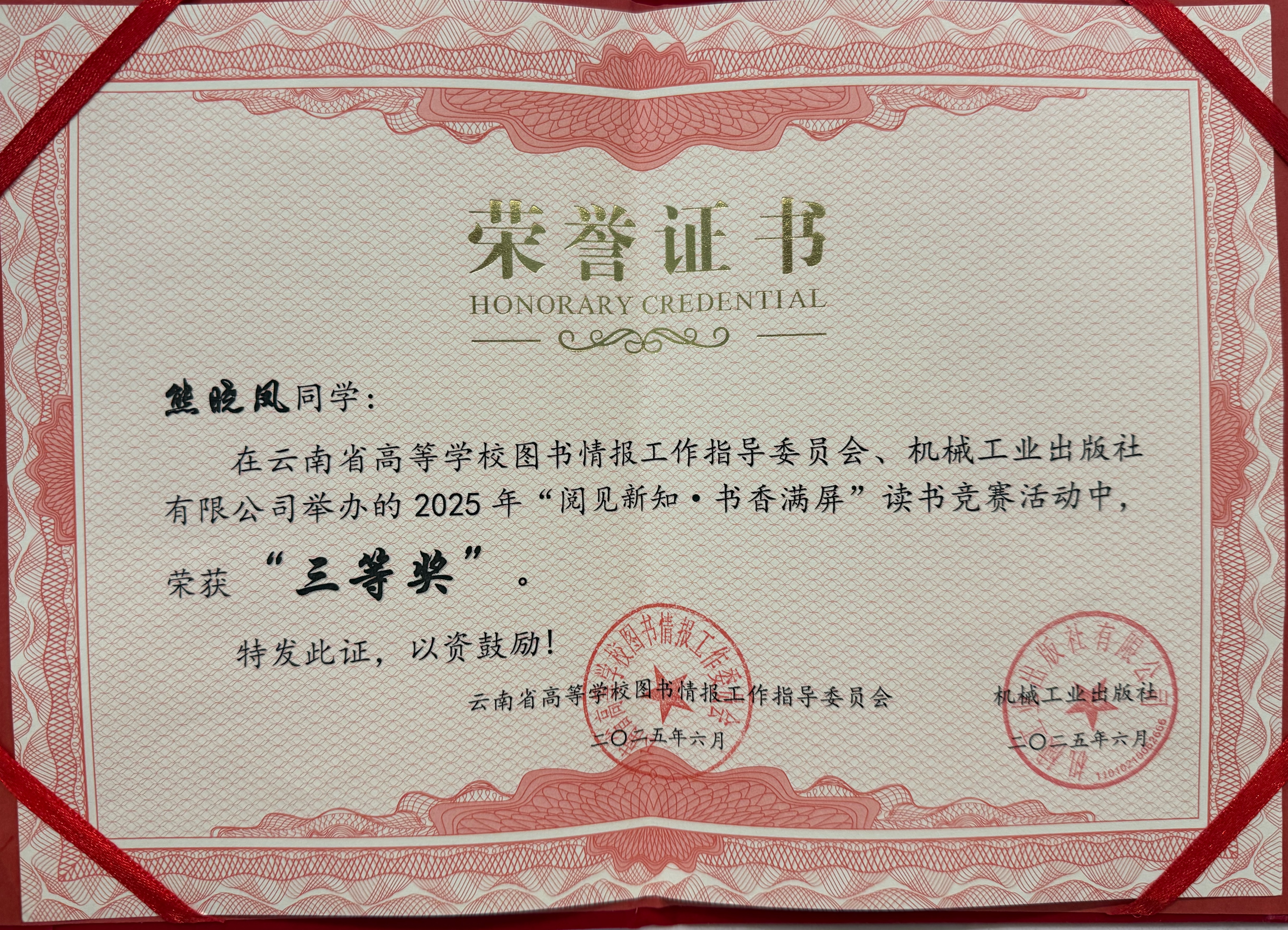 近日,由云南省高等学校图书情报工作指导委员会与机械工业出版社联合主办、云南农业大学图书馆承办的 2025 年 “阅见新知。书香满屏” 读书竞赛活动获奖名单正式公布。昆明传媒学院熊晓凤、陈静雯两位同学凭借扎实的阅读积累与出色的临场表现,在众多参赛选手中脱颖而出,荣获三等奖的优异成绩。