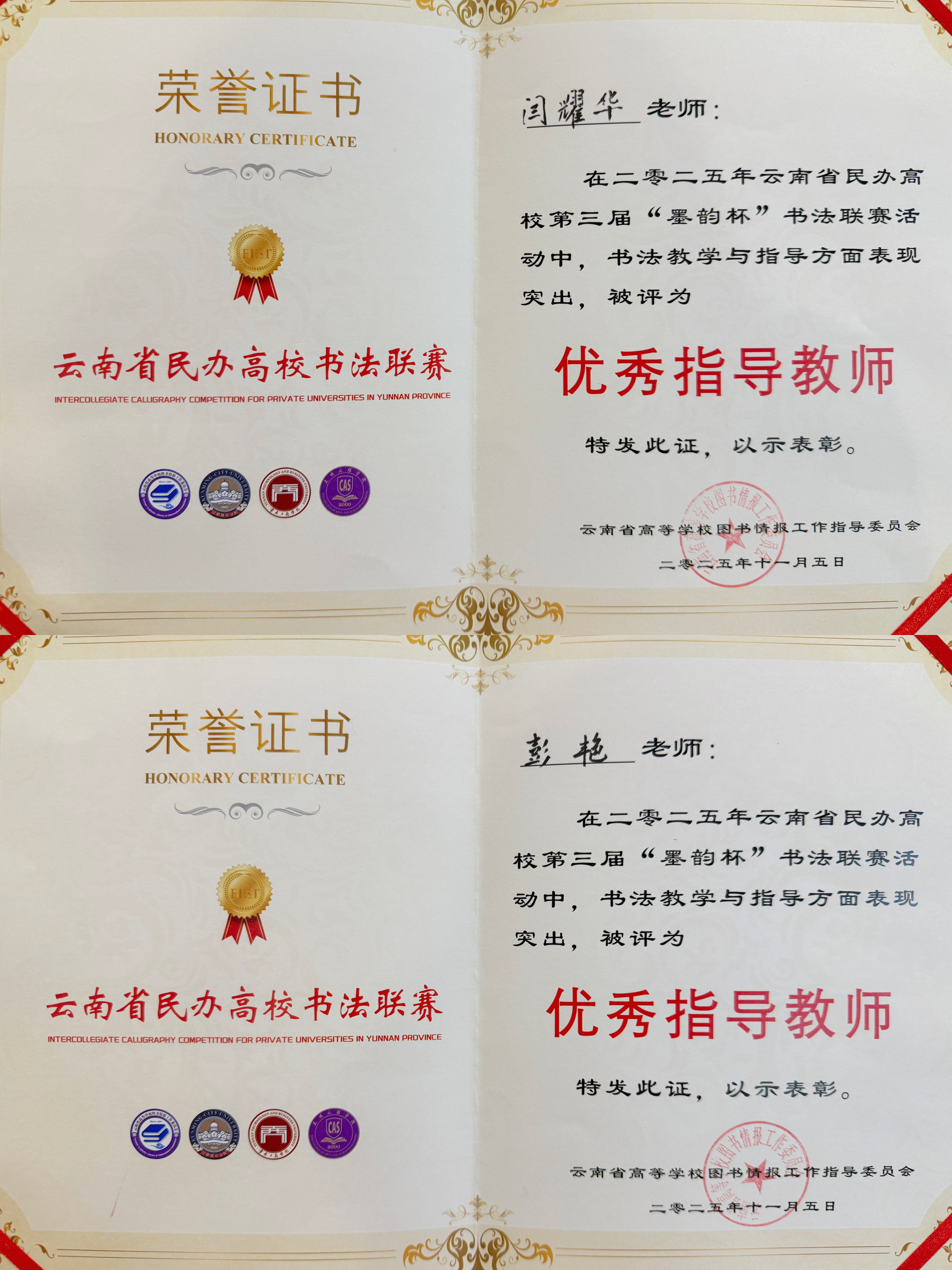 同时,学校还收获了“优秀组织单位”荣誉称号,闫耀华、彭艳两位老师因在书法教学与指导方面表现突出,被评为“优秀指导教师”。这些荣誉的取得,不仅是对昆明传媒学院学子书法水平的肯定,更是学校重视传统文化教育、着力培养学生综合素质的成果体现。