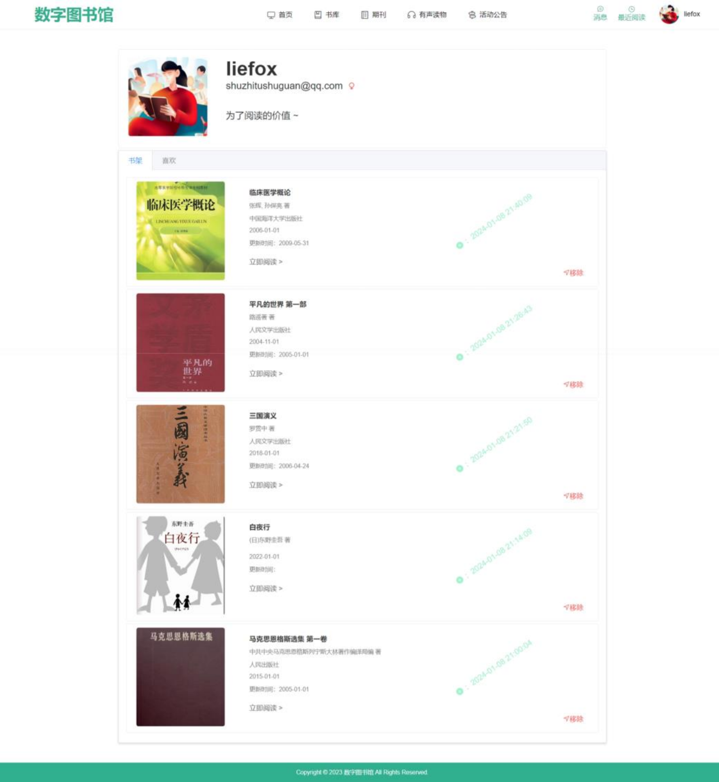 (二)书架管理:支持移除不想要的书籍,按加入时间排序,查找更方便;